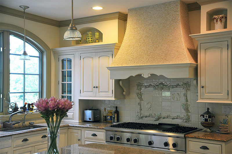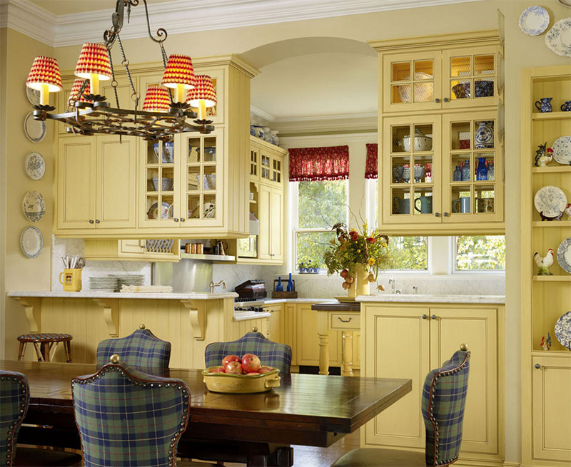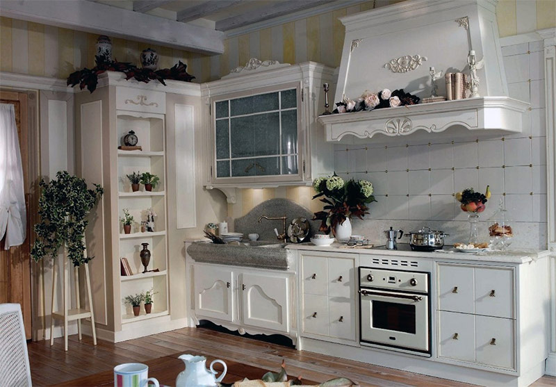 Il n'y a pas de place pour l'acier inoxydable ou une tuile parfaitement lisse. Les surfaces en pays français exigent une profondeur visuelle et supportent fièrement leurs imperfections.Couvrez les murs de la maison avec du stuc, du gypse, de la pierre (ou une combinaison des trois matériaux). Si vous décidez de peindre les murs, envisagez d'utiliser un vernis (une peinture qui imite le plâtre coûteux) ou d'autres méthodes de traitement dans lesquelles la surface du mur ne sera pas parfaitement uniforme. Pour les sols de ce point de vue, les meilleures options sont les sols en ardoise ou en calcaire, les carreaux de céramique, ainsi que le bois naturel.