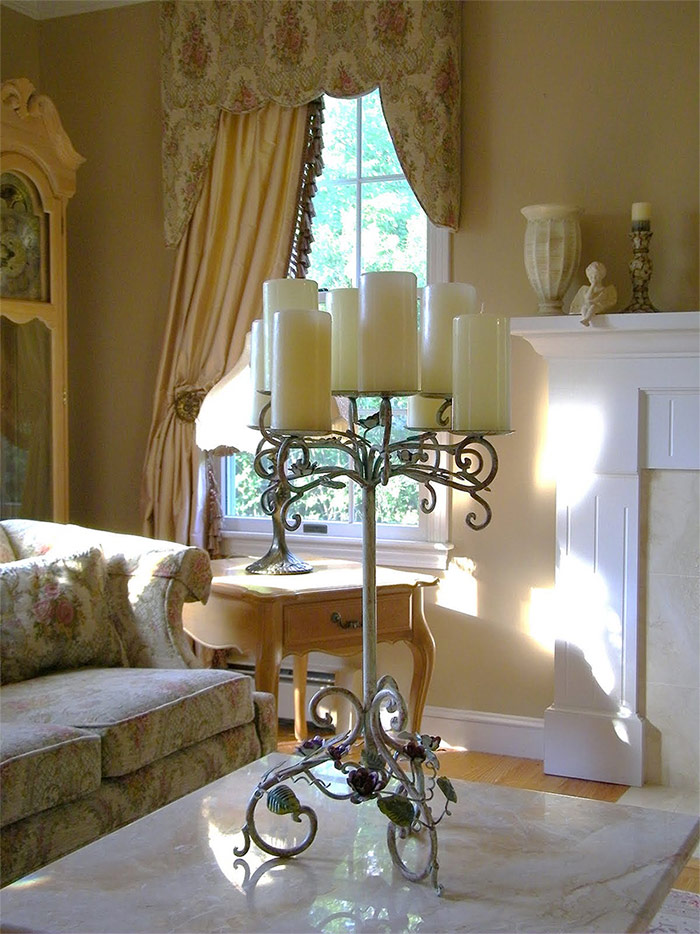 Le candélabre général posé sur cette table attire non seulement instantanément l’attention de ceux qui ont franchi le seuil de la pièce, mais peut également servir un objectif très spécifique. Il était une fois, les bougies étaient la principale source de lumière pour les résidents de la France rurale. Malgré l'abondance d'éléments décoratifs trop complexes sur ce candélabre, sa fonctionnalité potentielle élimine le sentiment de pathos excessif.