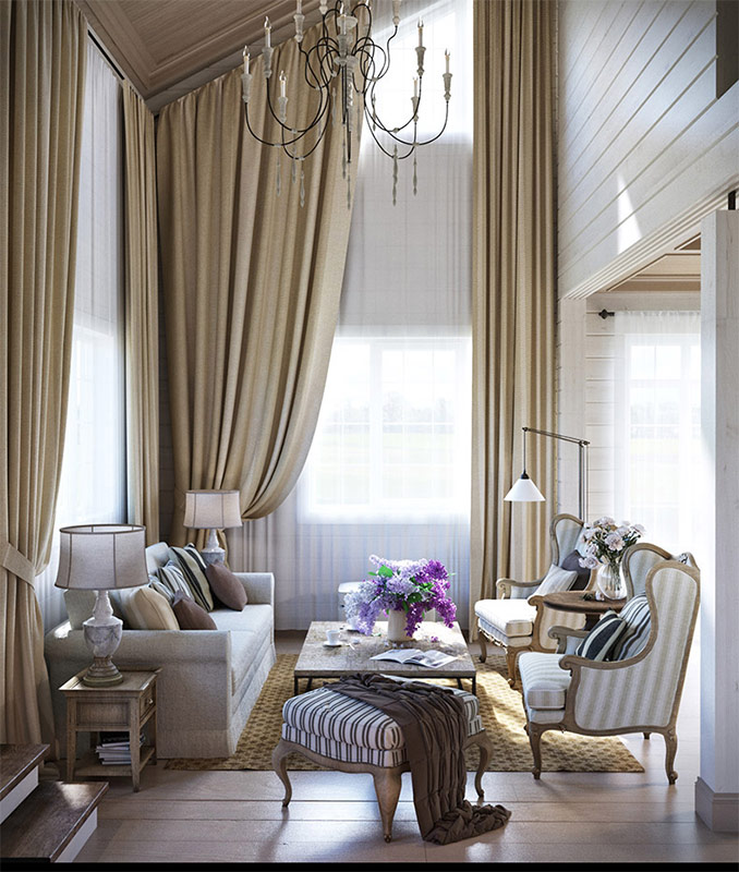 Pour les intérieurs de style provençal, les portes-fenêtres du sol sont idéales (portes et fenêtres d'origine). Mais comme c'est presque impossible dans nos appartements, vous pouvez installer des fenêtres avec des cadres à plusieurs sections à la place des fenêtres à la française classiques. En règle générale, la couleur des cadres est également blanche.