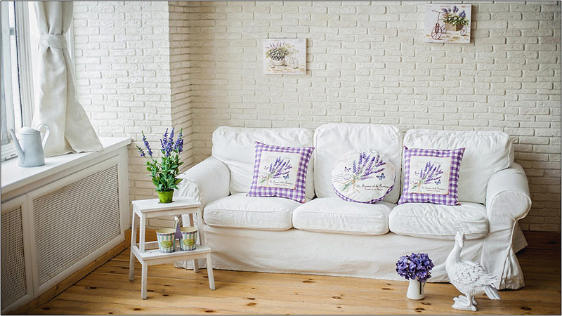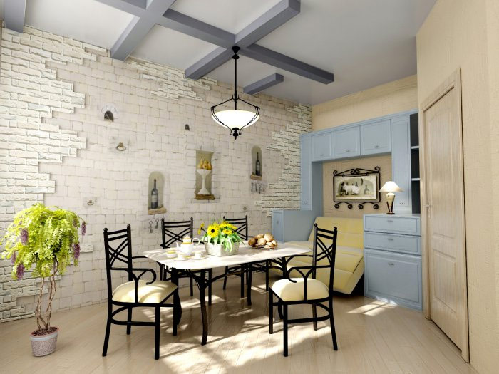 La décoration murale la plus couramment utilisée dans les intérieurs conçus dans le style provençal est le plâtrage. Le plâtre est appliqué grossièrement, avec des renflements et des irrégularités, avec une maçonnerie qui la traverse. Les intérieurs de style provençal utilisent du stuc texturé.