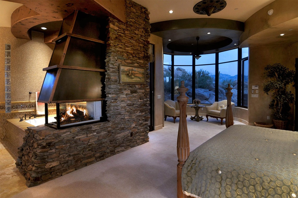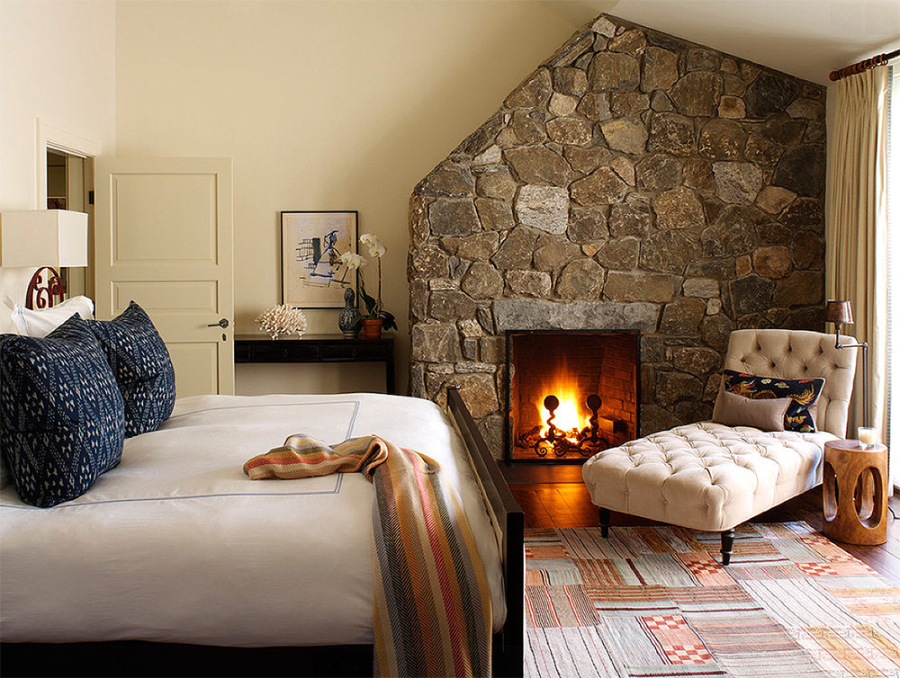 Une cheminée ajoute un charme rustique à cette chambre moderne.