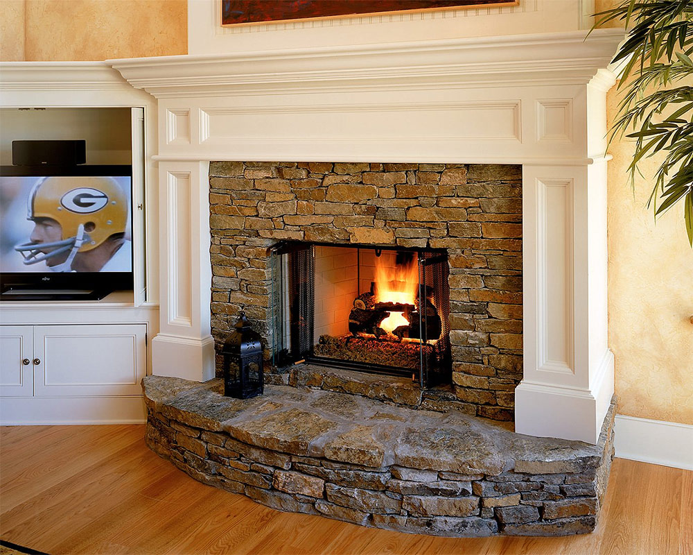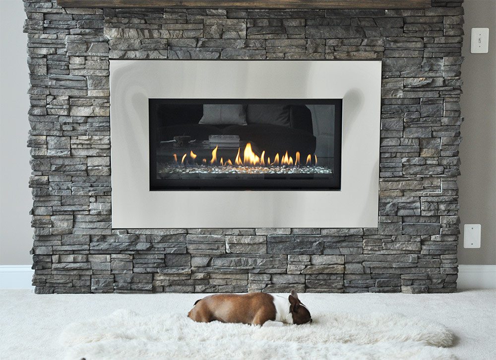 Pour donner à cette cheminée un charme inhérent à ses «frères traditionnels», le mur autour et au-dessus de la cheminée était fini avec de la pierre.
