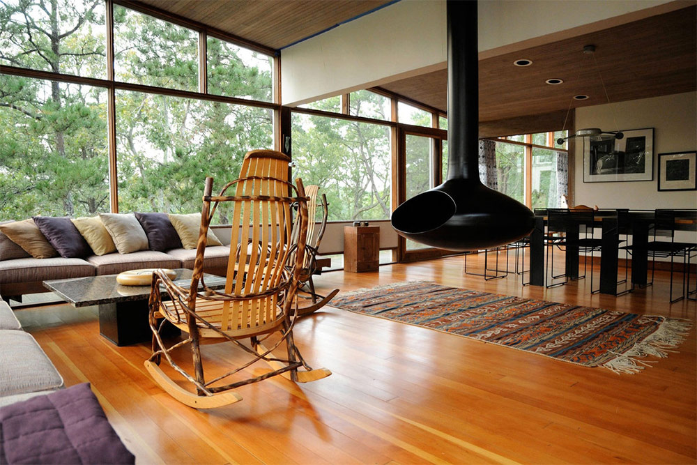 L'attraction principale de ce salon dans la maison de campagne est la cheminée, suspendue au plafond.