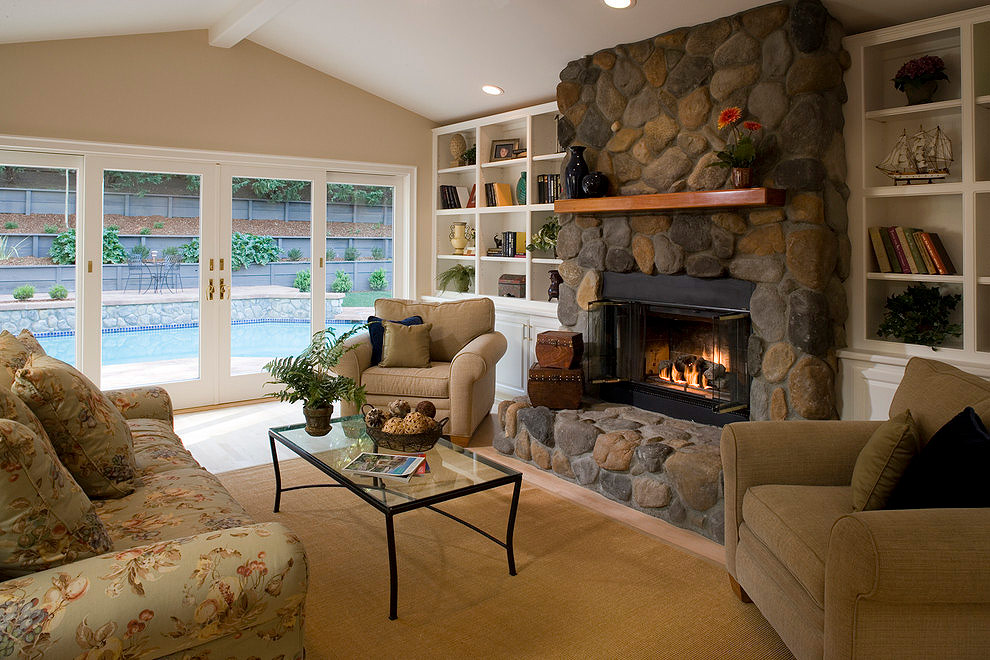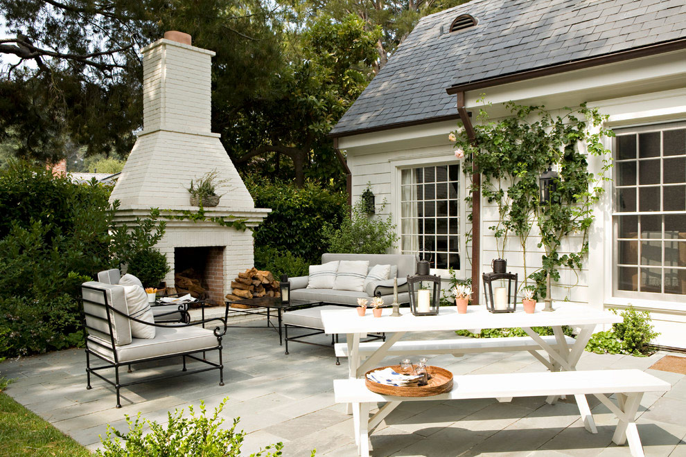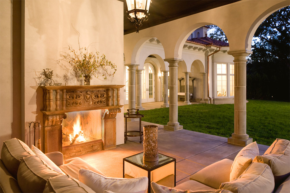 Véranda de luxe méditerranéenne avec une simple cheminée traditionnelle.