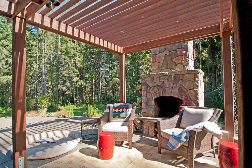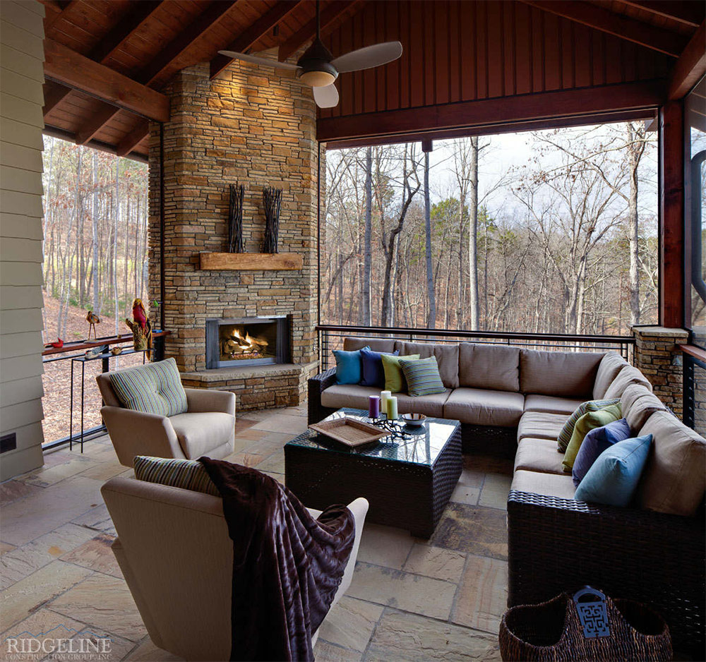 Véranda très intéressante avec une cheminée construite dans le mur de la maison.