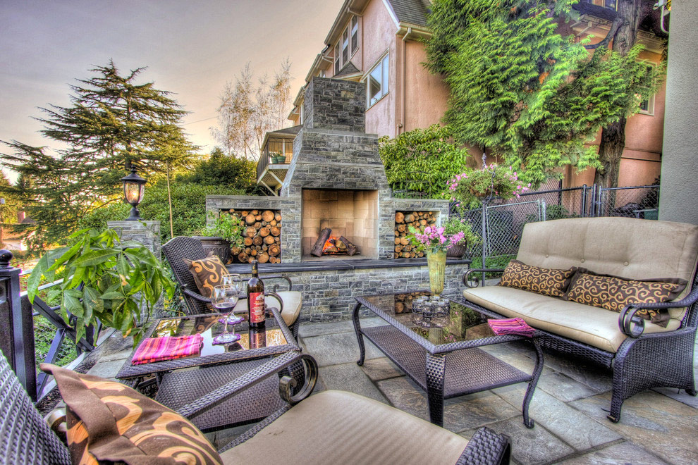 Coin salon extérieur encastré avec une magnifique cheminée en pierre.