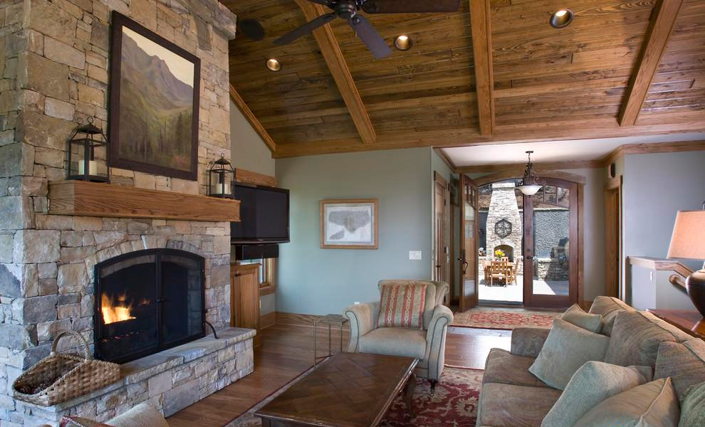 La combinaison d'une cheminée en pierre et d'un plafond en bois est tout simplement géniale ici.