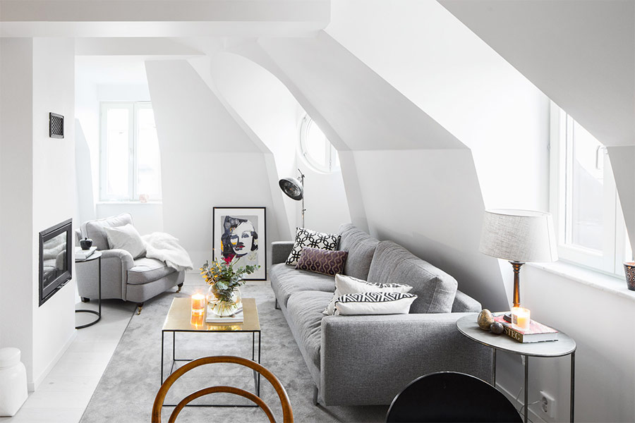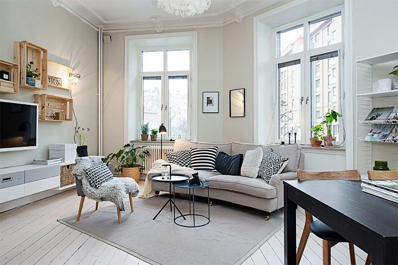 Comme nous l'avons dit, le blanc a toujours été dominant dans les salons scandinaves. Mais au cours des dernières années, une couleur neutre différente a été utilisée plus souvent - le gris, qui a rapidement remplacé le blanc et a trouvé un moyen de coexister avec ce dernier. De plus, cette tendance à la mode refuse tout simplement de disparaître. Il est temps d’apporter cette teinte à votre salon scandinave en y déposant un confortable canapé gris ou en peignant l’un des murs avec un accent gris fumé. Le gris clair a fière allure dans les intérieurs scandinaves, mais vous pouvez choisir une teinte plus foncée si vous souhaitez créer un contraste visuel accru.