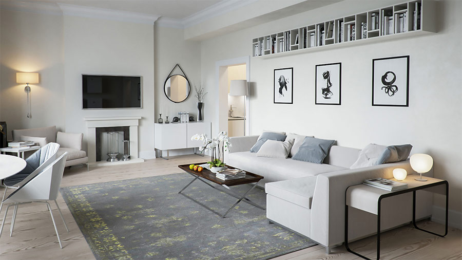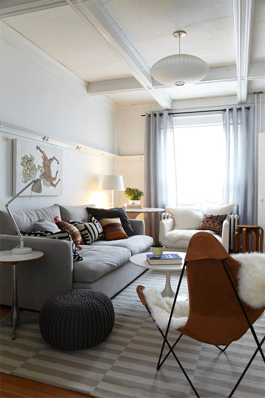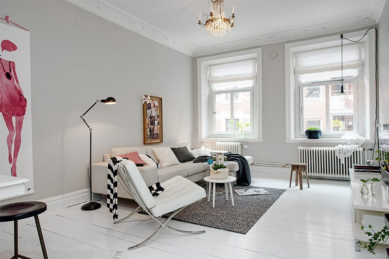 Lors de la décoration d’un petit salon, l’essentiel est de ne pas craindre la couleur choisie, sinon vous n’obtiendrez pas un style scandinave, mais une atmosphère typique et ennuyeuse. Vous pouvez ajouter d'autres couleurs avec de petits accents simples. Un miroir (ou même deux), un tapis moelleux, une table d'appoint élégante, une lampe de sol élégante et un fauteuil confortable contribueront à compléter l'image créée.
