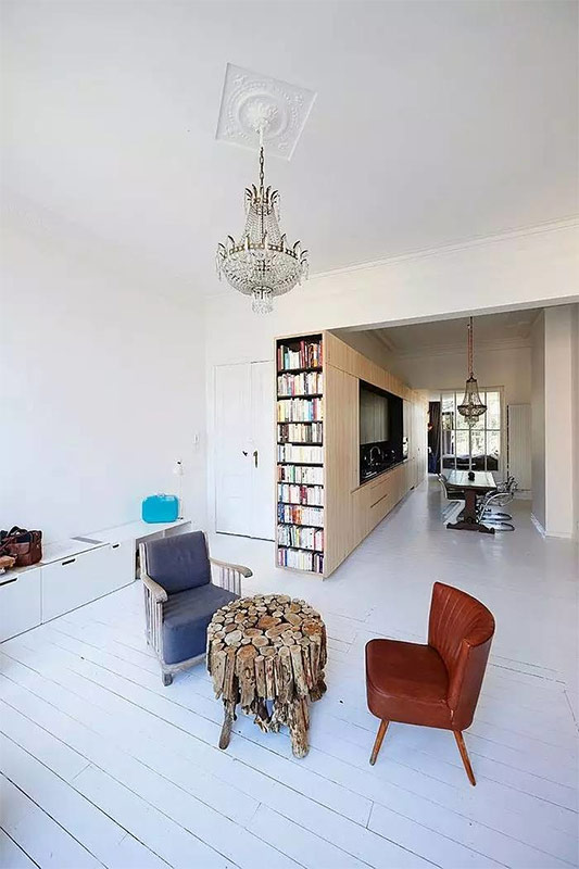 Une pile de livres ajoute de la couleur à cet espace de vie «stérile» (tiré de Resolution: 4 Architecture).