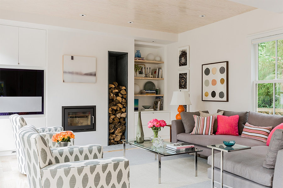 Les coussins de canapé et autres éléments décoratifs sont colorés et légèrement ludiques (tirés de Trunk Creative).