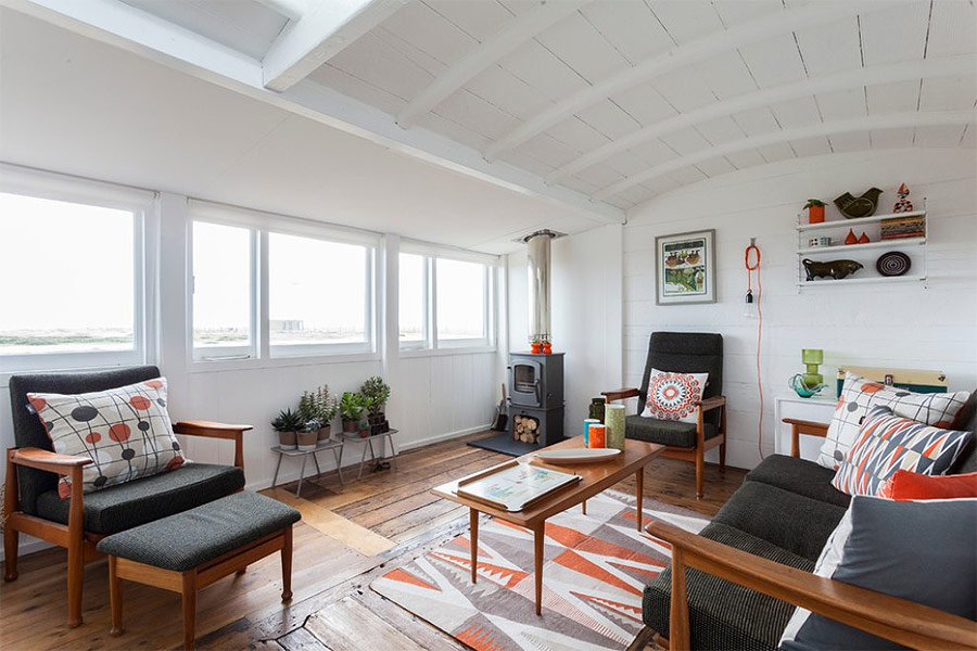 Salon calme avec des murs en bois chaleureux (par Retrouvius Ryland Peters & Small).