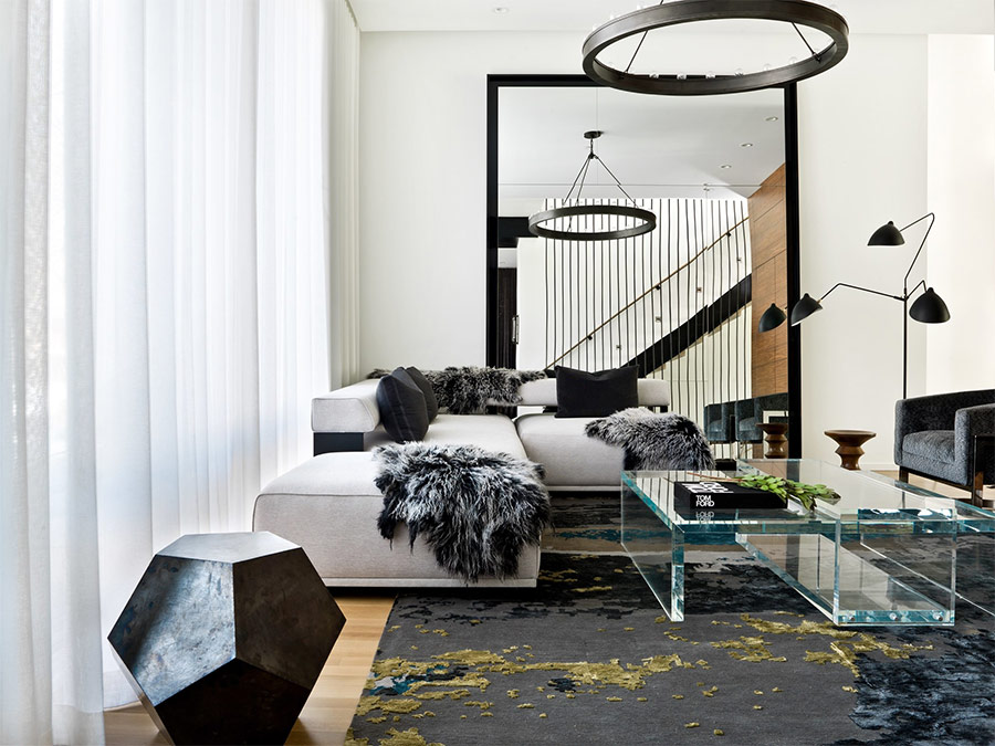 Salon noir et blanc avec d’élégantes touches de jaune (de Studio Revolution).