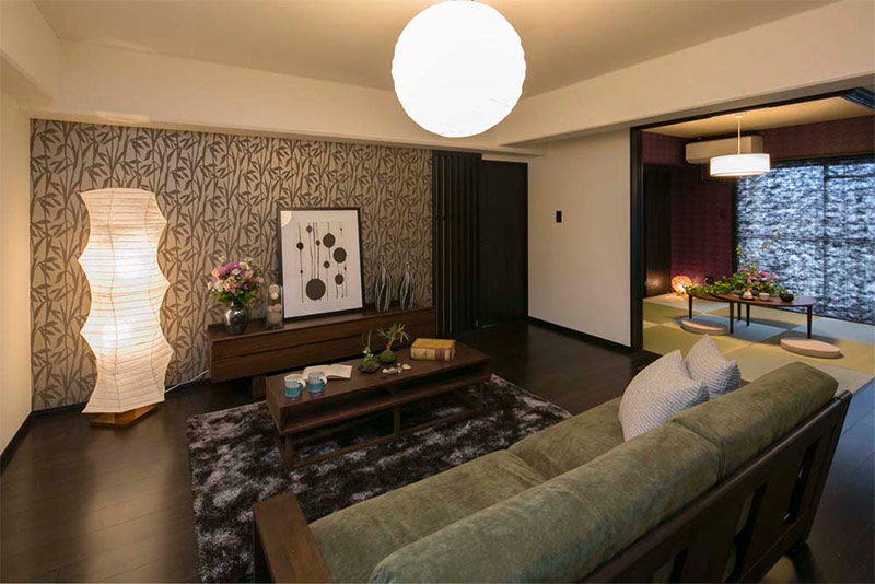 Même une conception de style japonais contemporain limite l'utilisation de surfaces en linoléum, en vinyle et en plastique. Il est acceptable de procéder à la finition de surface en utilisant des matériaux artificiels écologiques avec une surface décorative pour analogues naturels. Par exemple, un stratifié est choisi pour le sol au lieu du bois, au lieu de la soie naturelle, un tissu plus abordable doté de propriétés similaires est utilisé.
