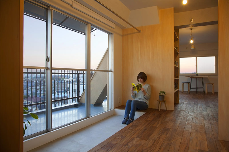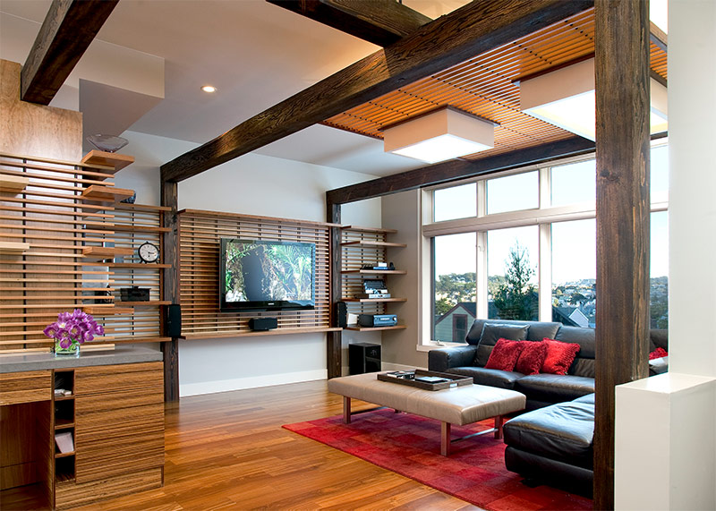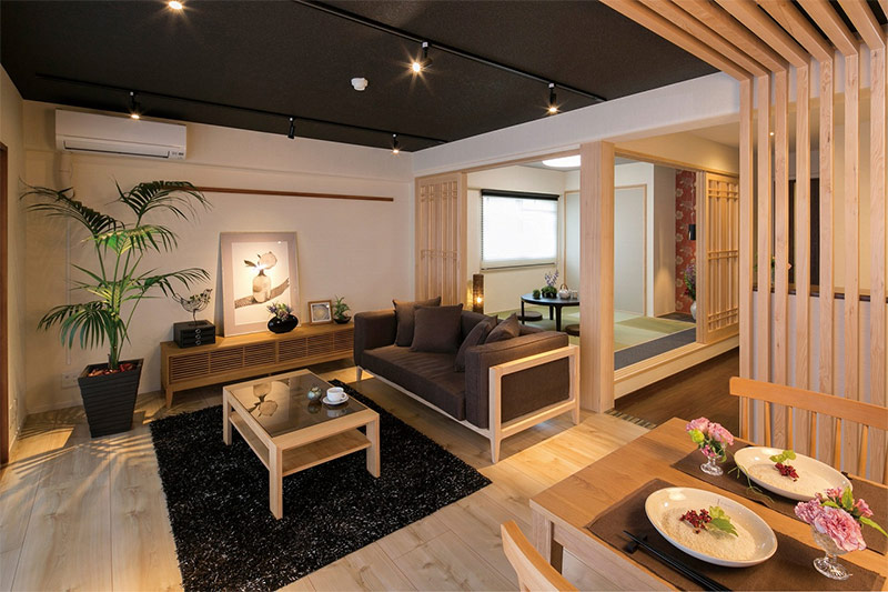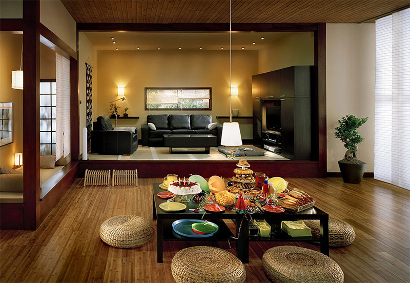 6. Pour désigner les salons utilisant des cloisons en bambou ou en papier racial sur un cadre en bois, les murs sont enlevés. Dans l'espace de vie devrait être autant d'espace libre et moins de choses.