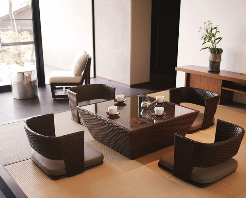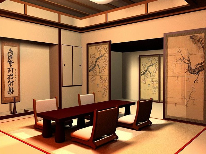 La décoration intérieure japonaise convient à une personne assise, contemplant son monde intérieur, méditant, se reposant à la maison après le tumulte du monde extérieur. Par conséquent, tous les meubles sont caractérisés par la terre. Comme si un meuble en bois ordinaire avait les jambes coupées et placées à même le sol. Le nombre de meubles est limité, le moins sera le mieux. Il ne devrait y avoir rien de superflu dans la salle.