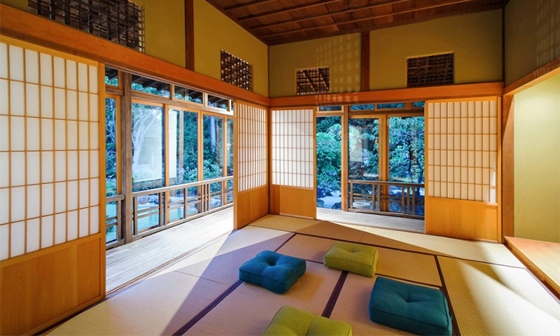 Il convient de noter non seulement la décoration intérieure des ouvertures de fenêtres, mais aussi leur conception extérieure. Habituellement, la maison japonaise était équipée de longues voûtes Engawa, qui permettaient à la lumière naturelle diffuse d'entrer dans la maison et dirigeaient les ruisseaux de pluie loin de la maison. Malgré le fait qu'il y ait beaucoup de fenêtres à l'intérieur japonais, peu de lumière pénètre dans la maison, le crépuscule règne dans la pièce. C'est l'une des caractéristiques du style. Ils n'ont pas peur des ténèbres et du crépuscule, ils l'ont laissé entrer dans la maison.