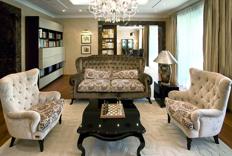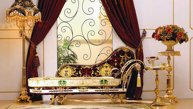 2. Les matières naturelles chères et rares sont au centre de l'attention. Ainsi, dans le salon, il peut y avoir un ensemble de meubles exclusif en cuir de crocodile, les poignées de porte peuvent être incrustées d'ivoire et de platine. Au lieu d'un tapis sur le sol, vous pouvez utiliser une peau de zèbre ou de léopard.