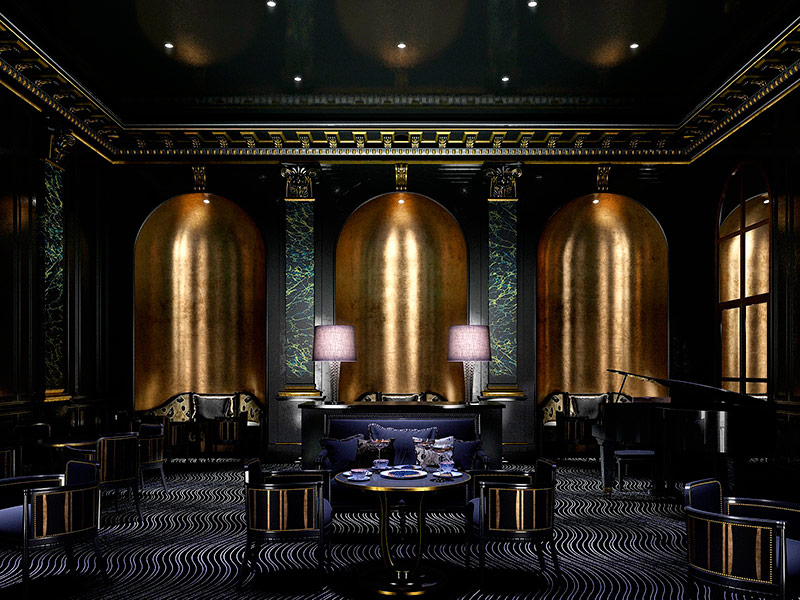 La couleur est conçue pour souligner le statut de l'intérieur.Outre l'utilisation du principe de contraste, les combinaisons de couleurs sont utilisées dans des couleurs similaires. Par exemple, les suites Art Deco sont décorées dans une palette de couleurs beige-or, soulignée par l'éclat des miroirs et du cristal, ou dans une palette de couleurs beige-rouge. Les deux intérieurs sont décorés avec des formes géométriques prononcées.