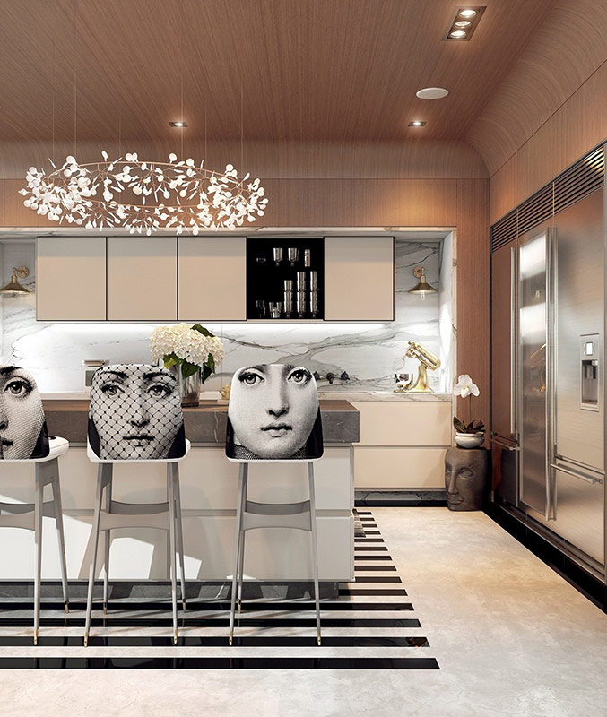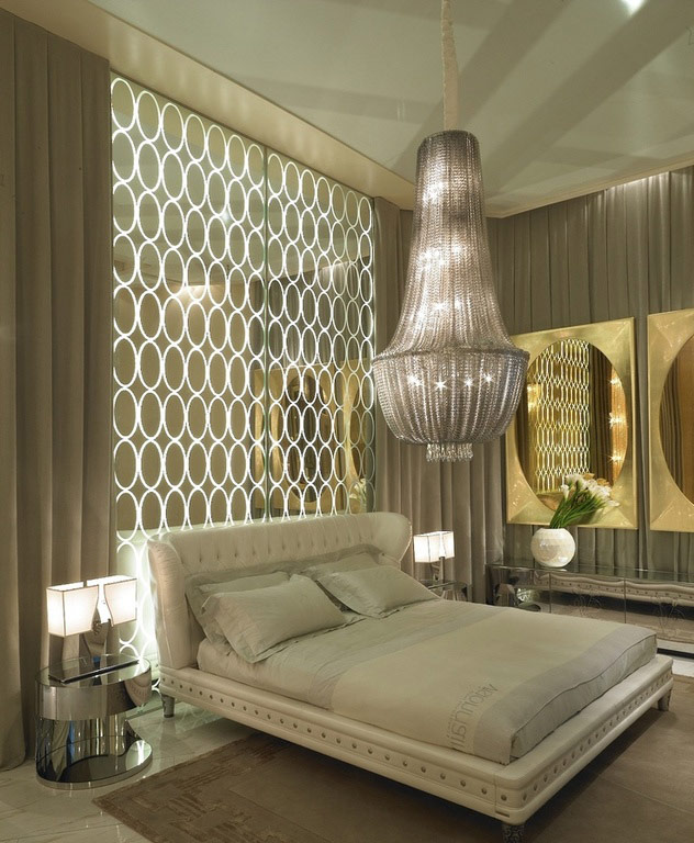 Étant donné que l'espace est rempli d'objets brillants exclusifs, les murs ne sont qu'un arrière-plan qui les distingue avantageusement. Les murs sont unis, parfois décorés de panneaux à motifs.
