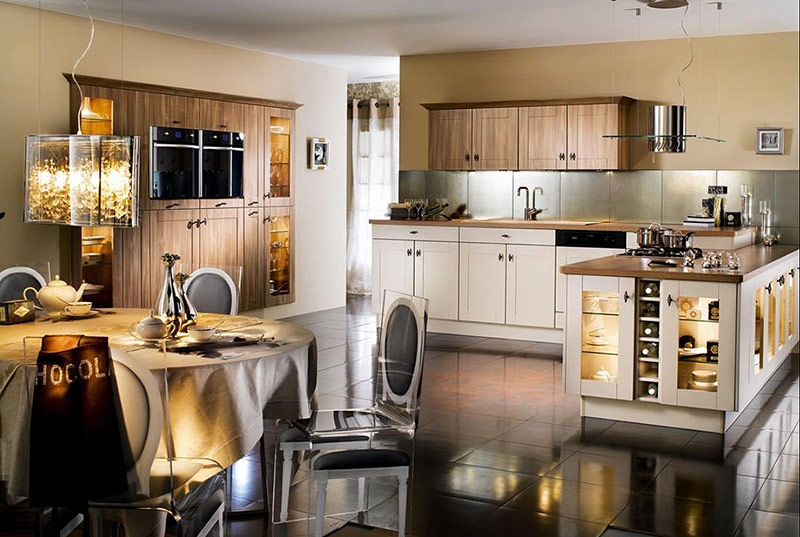 La cuisine Art Déco est dotée des dernières technologies et organise la zone de la manière la plus fonctionnelle possible. Au centre de la pièce se trouve un îlot avec plaque de cuisson, un espace de travail, un évier. Il possède nécessairement des armoires à vin exclusives, des niches lumineuses, une salle à manger riche. C'est elle qui occupe une place centrale dans la cuisine spacieuse. Il est équipé d'une grande table à manger et de chaises confortables.