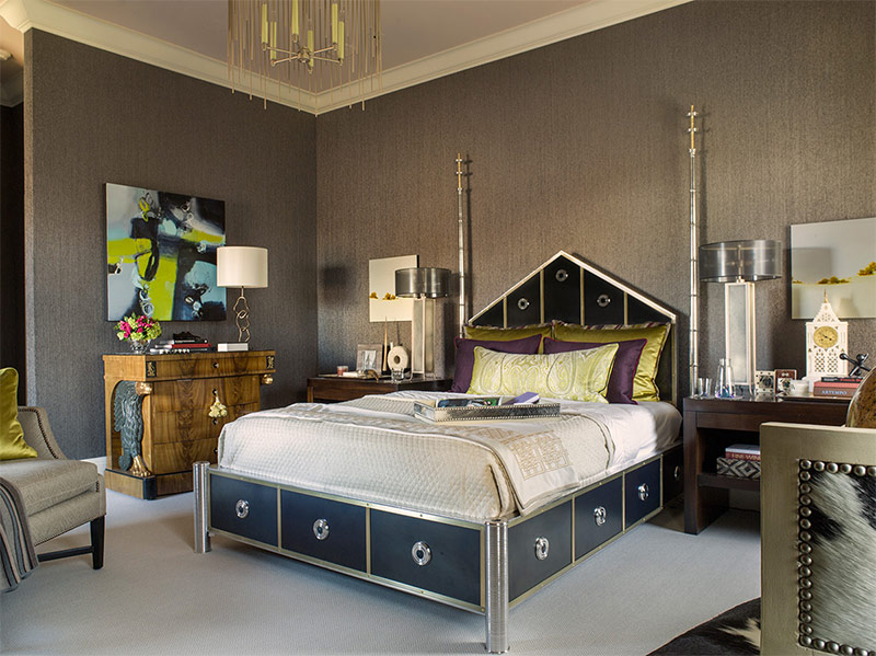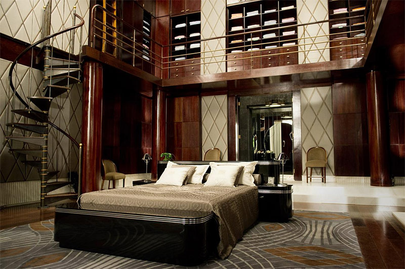 Pour l'aménagement intérieur de style Art déco, un mobilier aux formes simples et pratiques convient. Pour la chambre à coucher, ils choisissent un lit, qui est l'objet central. Il peut être équipé de pieds chromés, d'une tête de lit haute, d'une incrustation et d'une patine.
