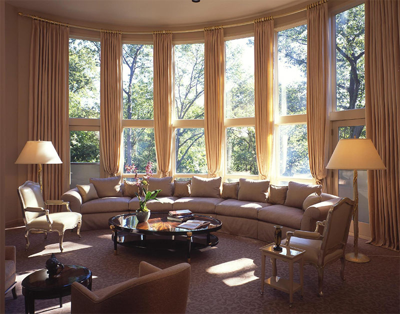 En règle générale, les fenêtres sont décorées avec de simples rideaux à rideaux en tissu épais avec des tentures. Selon l'interprétation choisie de l'intérieur - classique, historique ou moderne - vous pouvez choisir des rideaux multicouches avec des lambrequins, des rideaux japonais, même sous forme de peintures ou de rideaux lumineux modernes.