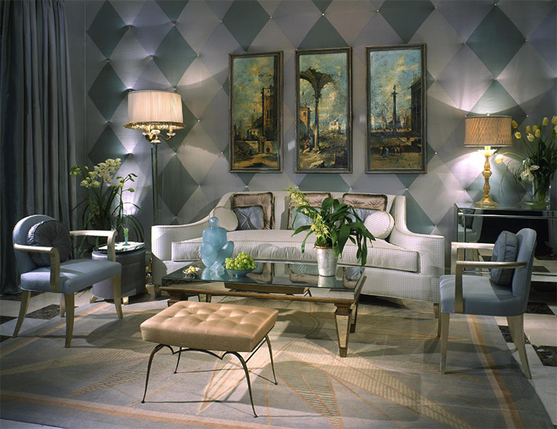 1. Le motif géométrique qui orne les murs et le plafond est la caractéristique principale de l'intérieur Art Déco. Les lignes droites et en zigzag peuvent orner les meubles et les textiles. Les motifs ronds ornent souvent le plafond et se reflètent directement par rapport au sol, ce qui se répète sur le mobilier ou la décoration.