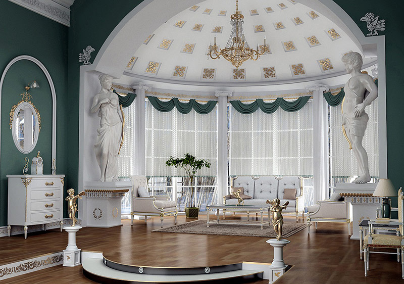 Les locaux sont décorés avec un décor naturel, architectural et sculptural. Le décor vivant est constitué de vases avec des fleurs et des fruits, de plantes d'intérieur (palmiers, fougères).Sous le décor architectural, on entend les portes et fenêtres cintrées, les colonnades, les podiums. Décor sculptural: bustes, statues antiques, fontaines, moulures en stuc, grands vases au sol.