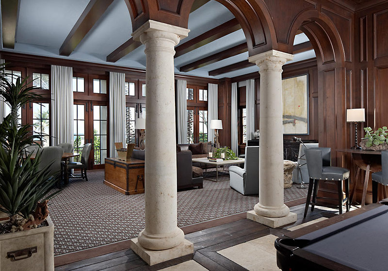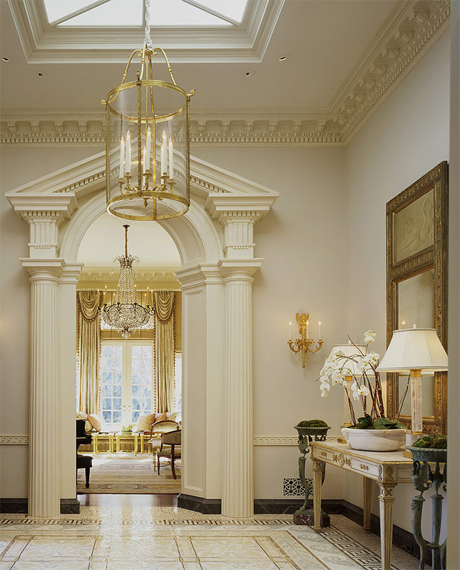 - La salle spacieuse est décorée de colonnes de polyuréthane blanches, ouvertes avec plusieurs couches de peinture (beige et blanche sur le dessus), puis recouvrant légèrement les bords. L'impression d'une pierre naturelle ou de marbre, vieillie par le temps.