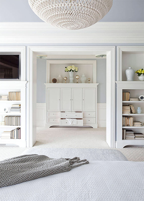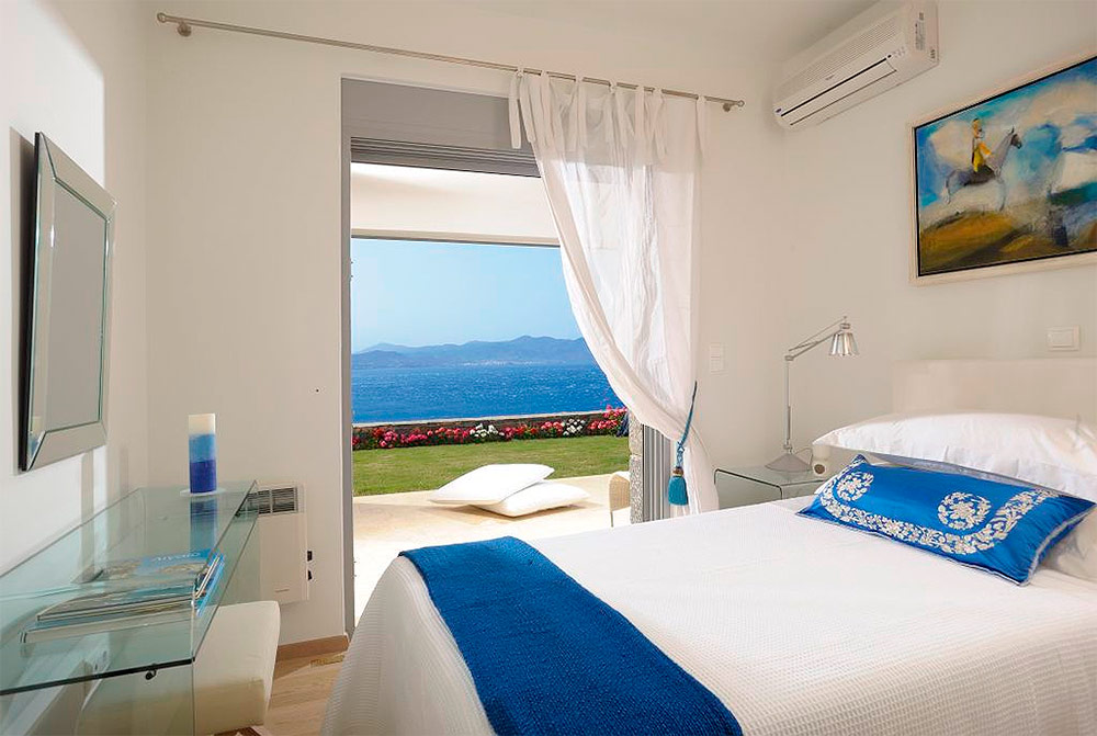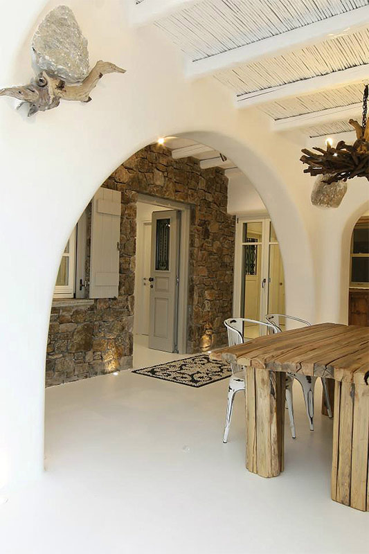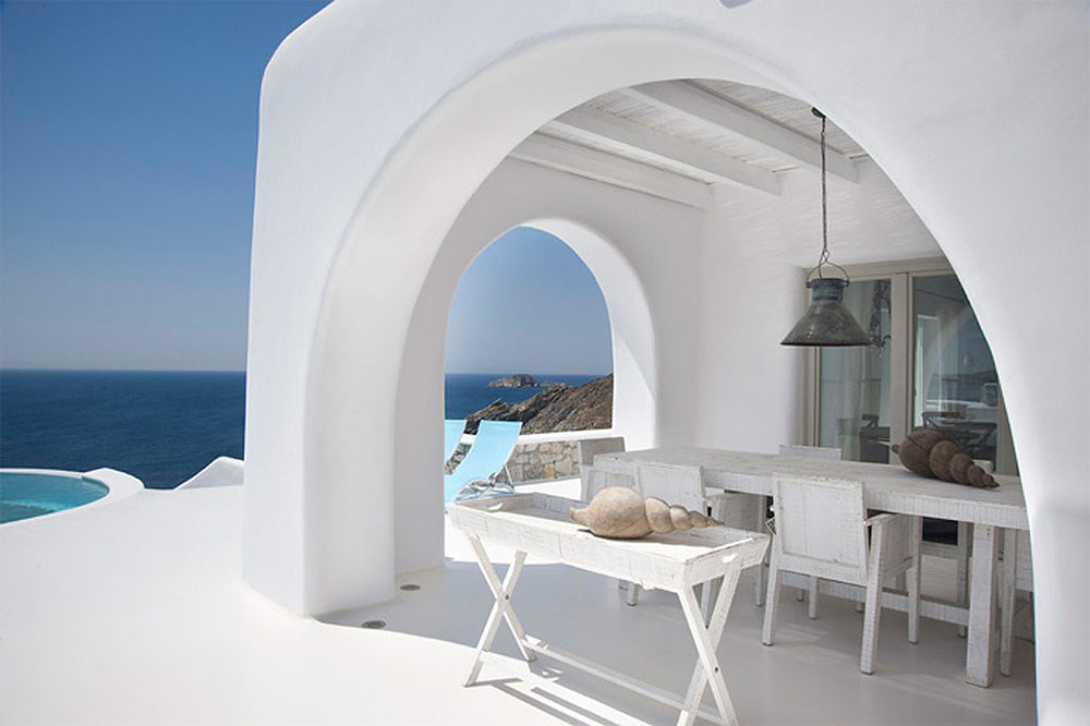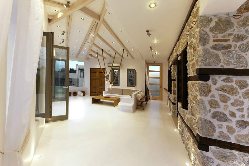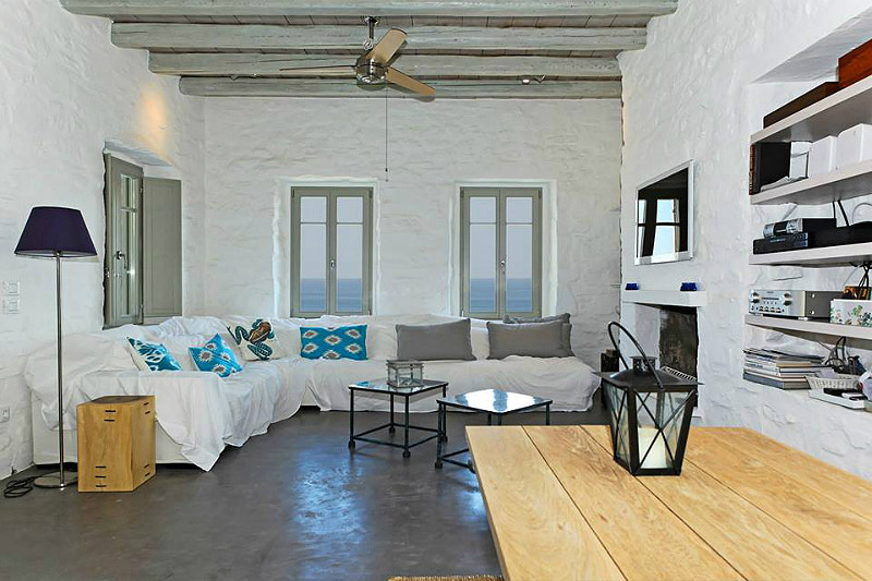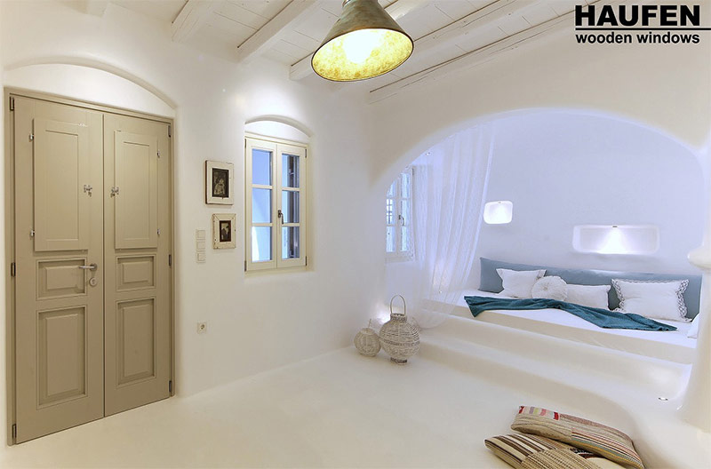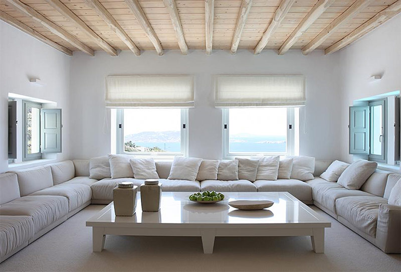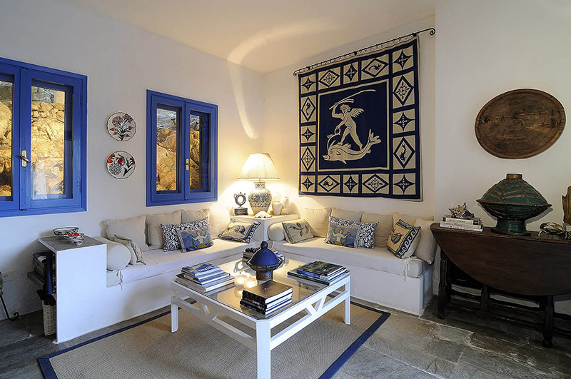 Les intérieurs helléniques authentiques sont souvent d'un blanc pur. Le sol, le plafond, les murs, les meubles sont tous blancs. Seul le décor apporte partiellement de la peinture à la palette épurée de la pièce.