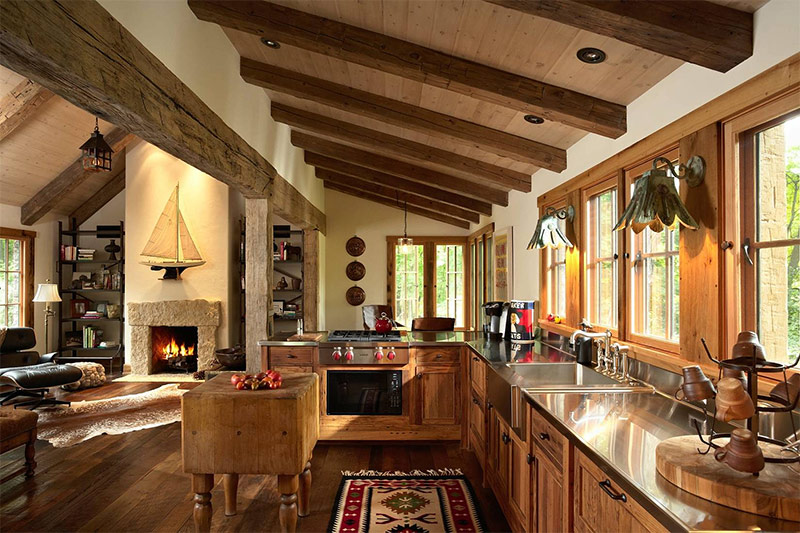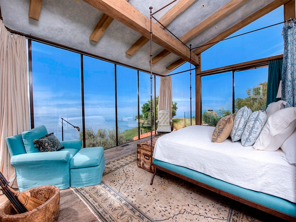 La décoration en tissu des lieux est restreinte. Utilisez des tissus naturels - lin, coton, fibre de bambou. Les fenêtres sont ridées avec des rideaux à la coupe simple sans fioritures et draperies. Des toiles simples avec un motif caractéristique d'ondes graphiques sont choisies. Il est important que chaque détail ne soit pas seulement esthétique, mais ait également une application pratique. Par exemple, des rideaux protègent de la lumière vive, un rideau de lit infernal - des moustiques, des oreillers sur un canapé créent des conditions confortables pour s'asseoir.