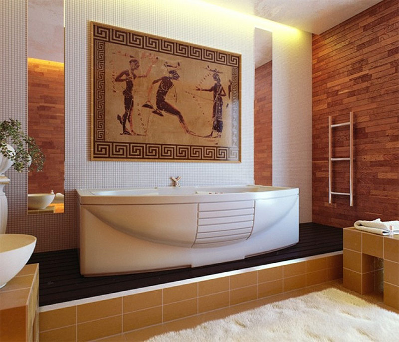 Les chambres sont remplies d'attributs qui renvoient directement aux traditions de la Grèce antique: amphores, sculptures de héros nus, navires en bois. Des colonnes, des niches et du stuc peuvent être ajoutés aux éléments décoratifs. Ils décorent l'intérieur et créent une atmosphère colorée.