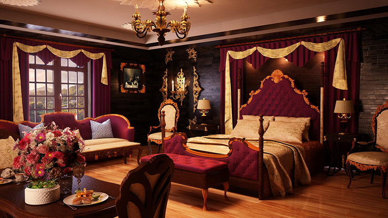 Les textiles sont décorés avec des crochets, des broderies dorées, des glands, des nœuds et des broches. La chambre à coucher crée l'image d'un boudoir royal à l'aide d'un design textile luxueux. Un couvre-lit en satin matelassé recouvrant le lit est complété par des oreillers décoratifs à bord volant. Un tapis naturel avec un motif est posé sur le sol. Le coin lecture et thé est aménagé avec un fauteuil moelleux et tapissé de soie.