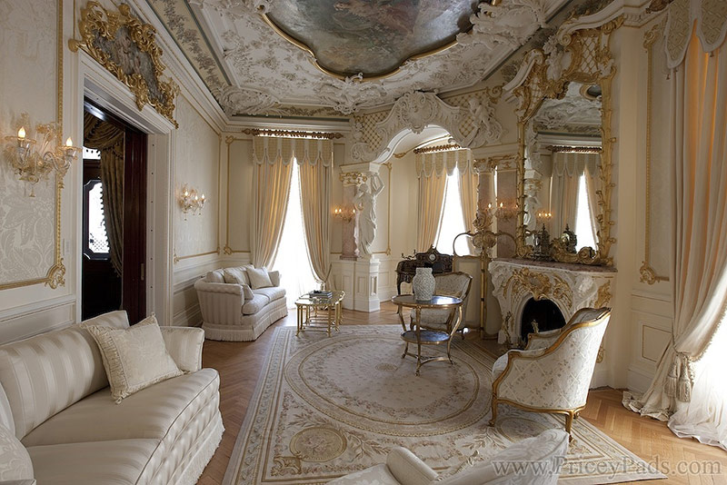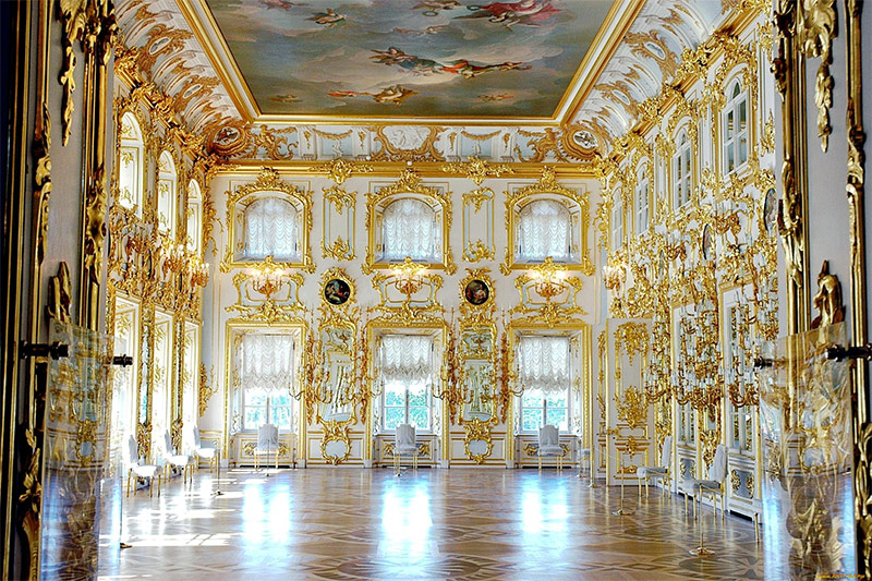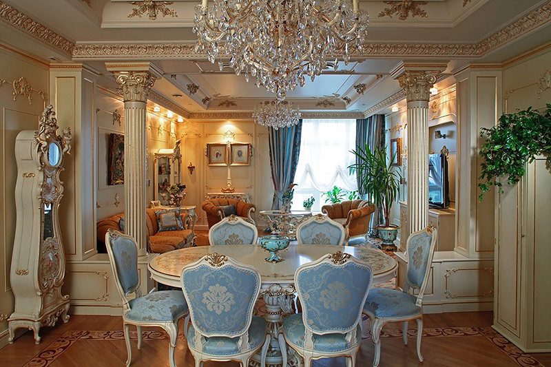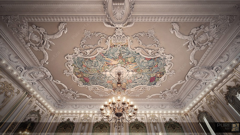 4. Le plafond est une extension naturelle des murs, dont les décorations passent doucement à la surface du plafond. Le plafond est décoré de peinture, stuc, fresque. Des lustres luxueux avec des pendentifs en cristal complètent le look élégant et majestueux.