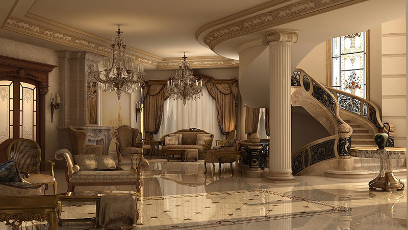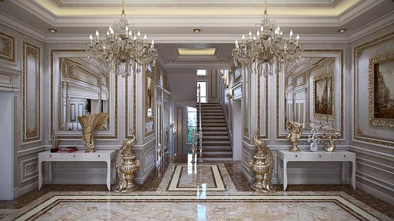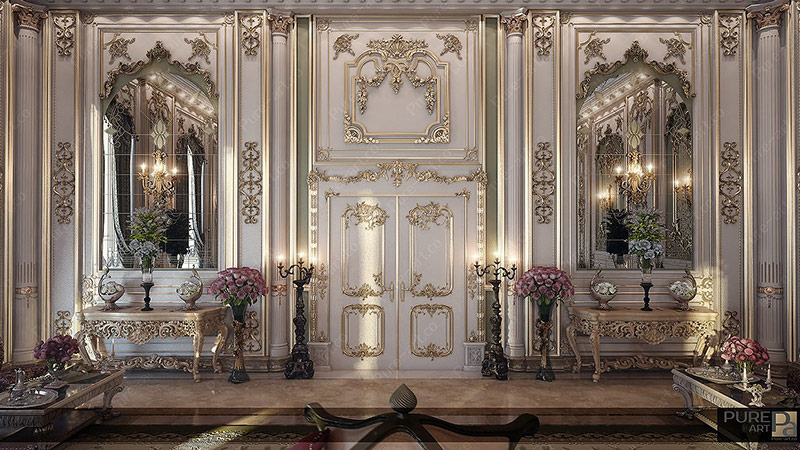 Chaque mètre de murs est décoré avec un chic particulier, remplissant l’espace de fresques, niches, inserts en marbre, colonnes, peinture monumentale et moulures en stuc doré. La tâche principale du style est d’étonner l’imagination du client, de le charmer, de le faire geler à la place. Le mur n'est en aucun cas uni, recouvert du même type de matériau. Pour elle, plusieurs matériaux coûteux sont sélectionnés, combinés et décorés avec un décor supplémentaire.