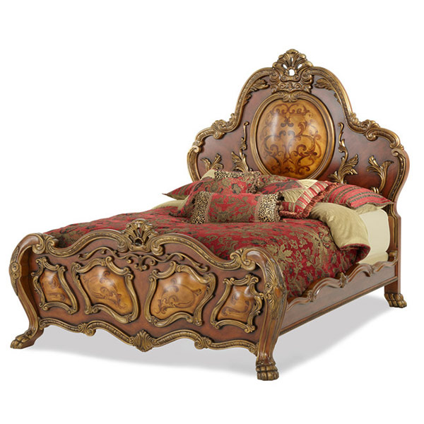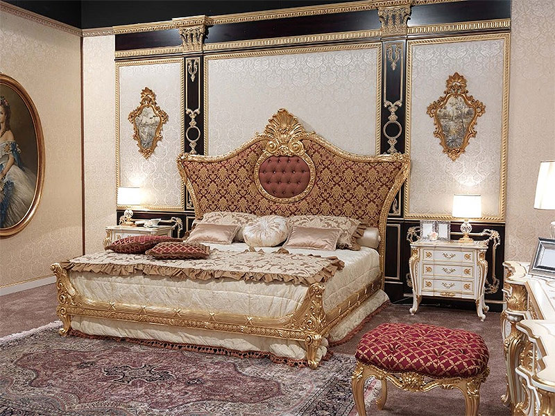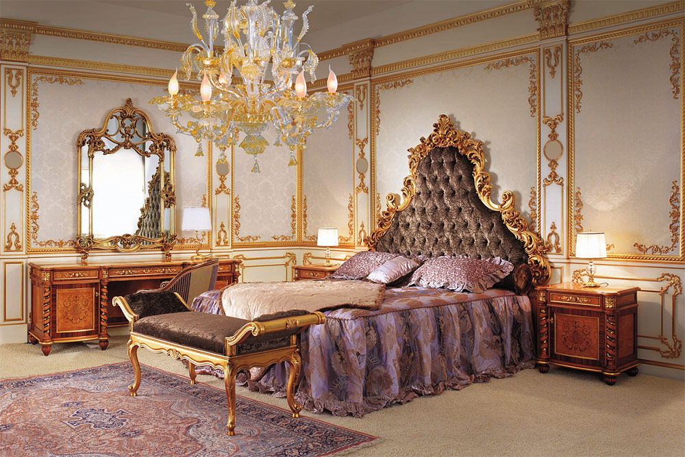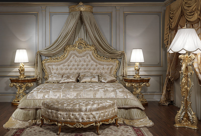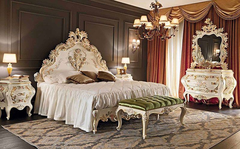 De grandes tables à manger avec des chaises de signature ont véritablement décoré les salles à manger. Des pieds dorés torsadés, des plans de travail massifs avec des mosaïques et des sculptures artistiques complétaient l’incrustation de bois précieux. Lits baroques chics décorés de baldaquins; élevé, monter sur le podium.