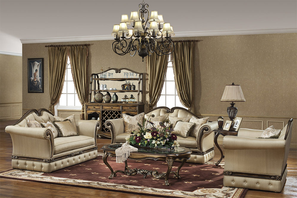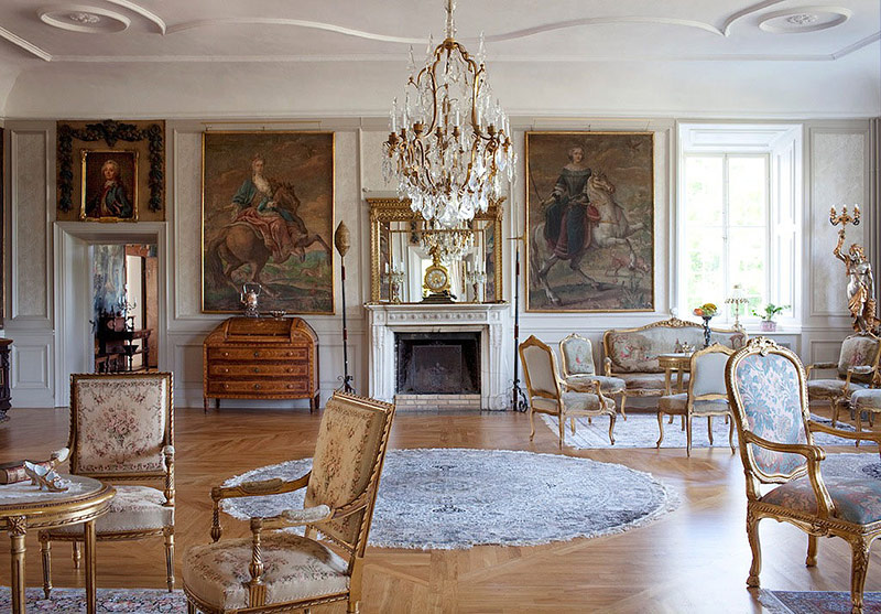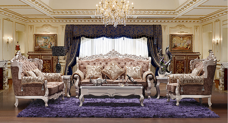 Pour créer l'intérieur des temps de Louis XV, les salons modernes sont meublés avec des fauteuils confortables et des canapés luxueux. Comme les analogues historiques, ils ont les jambes arquées, le dos élevé et sont décorés de sculptures sur bois, de dorures et de mosaïques. Le salon spacieux peut accueillir plusieurs canapés en même temps, formant ainsi des espaces de détente. La quantité de meubles rembourrés dépend de la taille de la pièce.