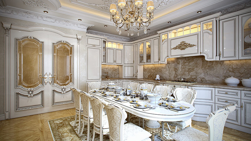 Pour reproduire l'intérieur des locaux du palais dans des maisons modernes, les concepteurs utilisent le principe de la division du mur en zones. Chaque zone est décorée de manière particulière. Il est important que le mur et le plafond donnent l’impression d’un espace unique, décoré selon un principe.