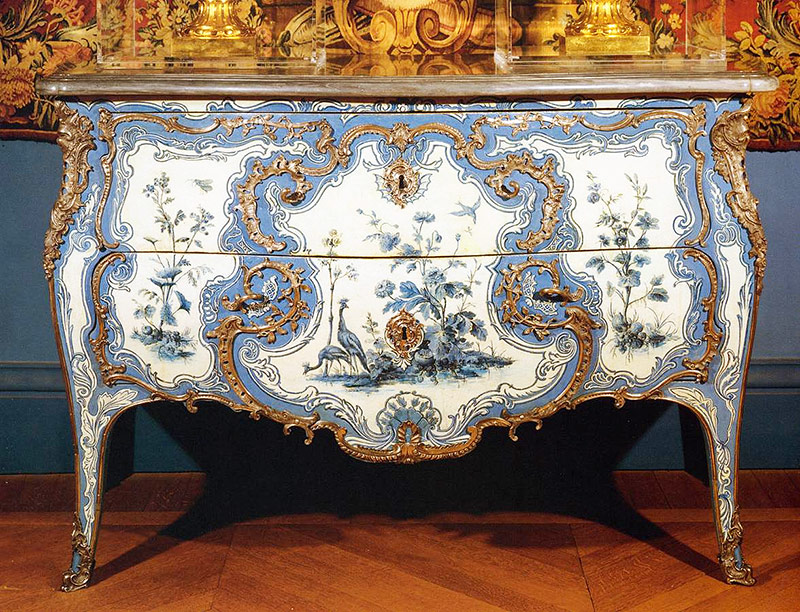 Ce sont précisément les différents meubles artistiques qui donnent au palais la saveur des salles modernes. Il a généralement une petite taille, un beau design, un design confortable. La variété de meubles dans le style rococo est excellente - ce sont des canapés, des tabourets, des chaises à haut dossier, des fauteuils, des lits, des canapés et des bancs. Ils se distinguent par la forme incurvée des pieds, une belle garniture en soie ou en satin avec des ornements floraux ou orientaux, une dorure, une mosaïque, une marqueterie, une sculpture sur art. Le mobilier est choisi parmi le bois naturel (tilleul ou noyer), décoré avec des ornements bouclés de fleurs et de vignes. Les objets uniques apparus à l'époque rococo sont considérés comme un secrétaire, un cabinet d'importants papiers (cantonier).