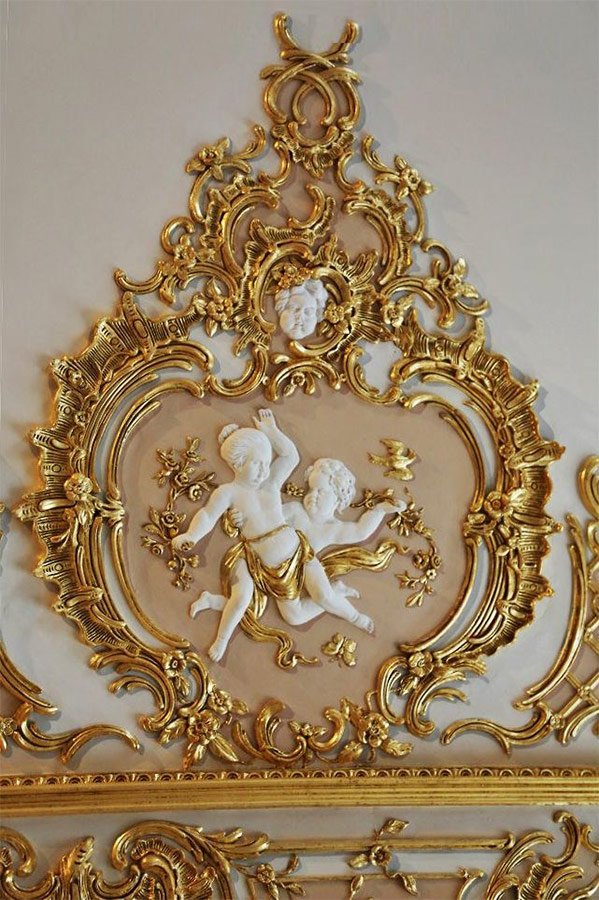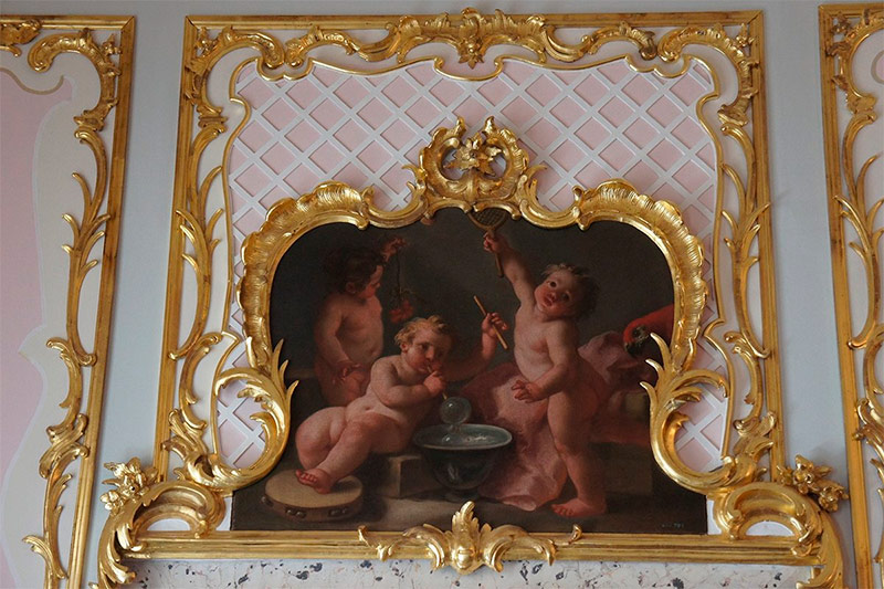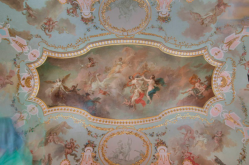 Le style rococo à l'intérieur s'inscrit dans la tradition baroque et utilise activement la peinture murale des murs et des plafonds. Le récit des dessins est construit sur la mythologie, mais plus sur les relations humaines. Le sujet le plus vu de l'amour et des relations entre hommes et femmes. Le rococo est reconnaissable à l'image du firmament, des nuages et des anges dans les nuages. Un tel thème ornait nécessairement les arches du palais.