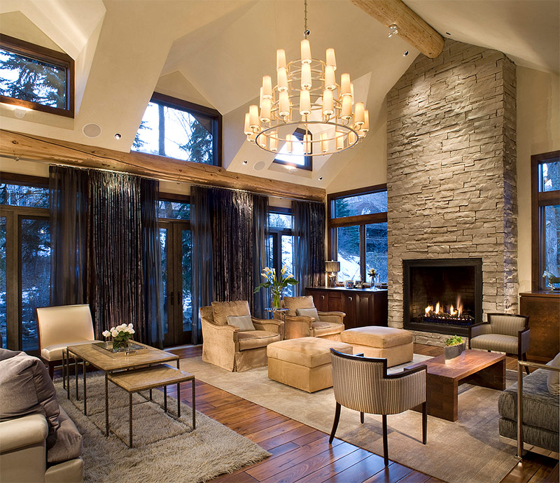 Peut-être un éclairage supplémentaire sous la forme de lampes murales. Ils sont souvent utilisés pour le zonage. Leur base doit être en matériau naturel et le plafond doit être conique ou arrondi.