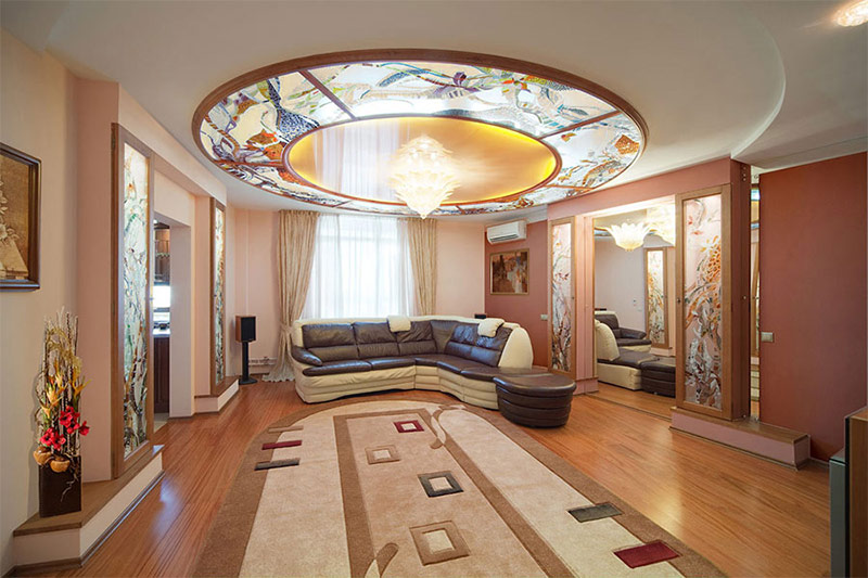 Les vitraux sont souvent placés au plafond, ce qui est un attribut invariable et très important de la modernité. Éclairés par une lumière feutrée qui ne blesse pas les yeux, ils créent une ambiance particulière dans la pièce. De plus, un vitrail réalisé par le propre projet du propriétaire est un excellent moyen de vous exprimer et d’apporter votre contribution personnelle à la conception de la pièce.