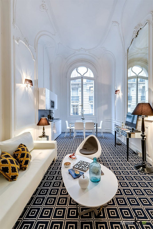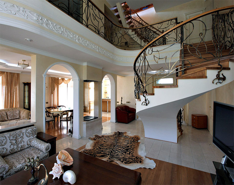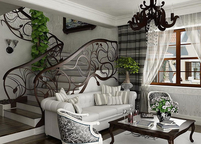 L'Art nouveau a tendance à avoir beaucoup d'espace libre, aussi une salle de taille moyenne et plus grande convient-elle à ce style. Meilleur si c'est un studio. Son agencement permet de zoner discrètement l’espace, en utilisant uniquement des revêtements de sol et des cloisons ornées ajourées avec des lignes cintrées nécessairement ondulées. La ligne de démarcation sur le sol ne doit pas avoir de coins, être lisse. Vous pouvez dupliquer des lignes de zonage avec des cloisons, des meubles, des tapis, de grands éléments de décoration et même des motifs de sol.