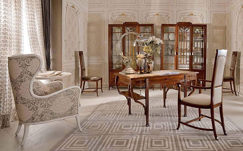 Le style de mobilier correctement sélectionné est pratique, confortable, avec des contours lisses. Elle doit faire signe de se reposer. L'absence totale d'angles. Canapés, les lits ont une asymétrie maximale dans le dos. Le dos des chaises déferle de vagues étranges. Les proportions de meubles d'armoires sont aussi dominantes que possible dans le sens vertical.L'Art Nouveau est un style très flexible, donc les meubles classiques avec une forme bizarre s'y adaptent parfaitement. Les meubles au style minimaliste lui conviennent également s’il est complété par un décor approprié, des motifs expressifs et des détails en vitrail. La règle principale dans le choix des meubles que vous ne pouvez pas dévier est la couleur et le matériau naturels.