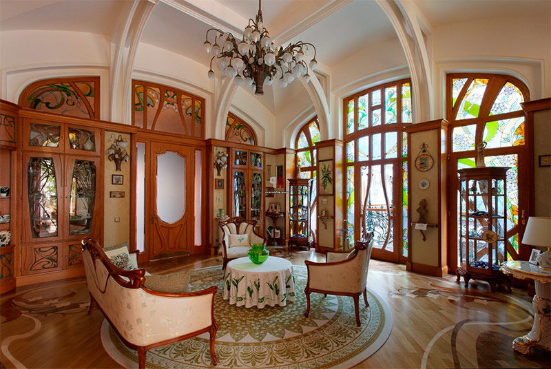 #6. Fenêtres orientées vers le haut, souvent cintrées ou immenses, telles que des vitrines, ornées de décorations florales. Dans le style Art nouveau, les fenêtres ne sont pas seulement utilisées aux fins pour lesquelles elles ont été conçues, mais elles constituent également un élément à part entière de la décoration de la pièce, complétant et souvent insufflant sa conception.