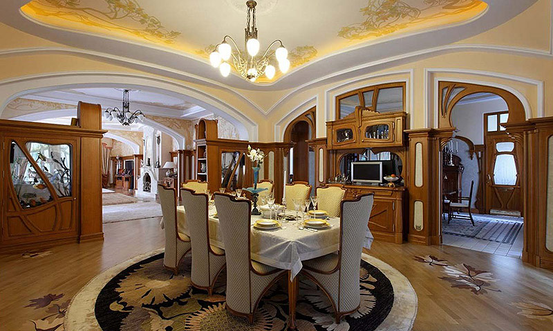 #1. Une abondance d'éléments en bois.L'intérieur Art Nouveau n'accepte pas les faux matériaux. Le bois est le plus abordable et le plus polyvalent. Il crée des meubles, des panneaux muraux, des murs, des plafonds, des sols, des fenêtres et des portes. Le plus souvent, on utilise un arbre à bois dur avec une structure prononcée: hêtre, chêne. Lors du traitement, il n'est pas autorisé colorant terne, masquant la structure des fibres.