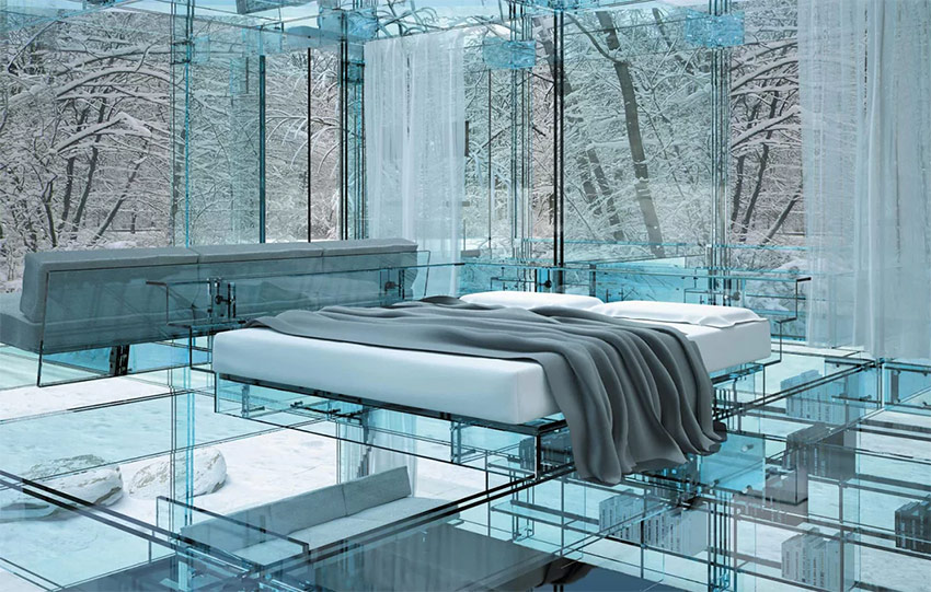 En plus de notre mobilier habituel - tables basses avec plateau transparent, étagères dans une vitrine avec vaisselle - chaises en verre inhabituelles (colorées et transparentes), armoires fabriquées. L'exemple le plus inhabituel serait un lit de designer en verre.