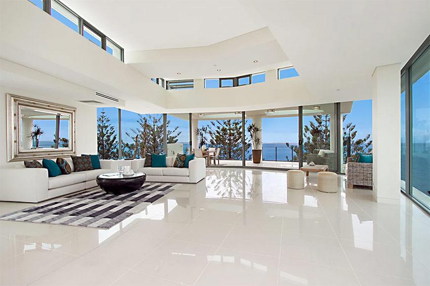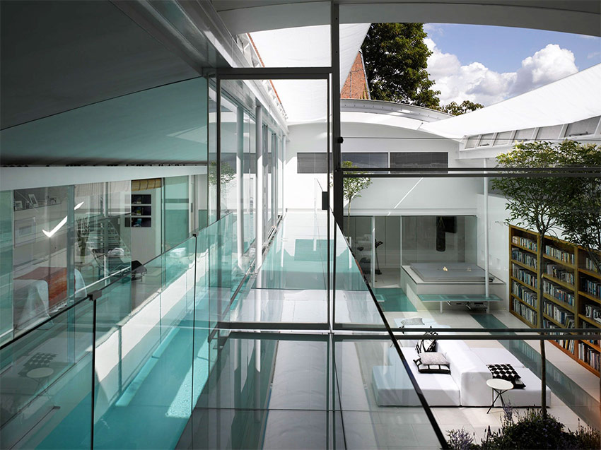 La façon la plus exotique d'utiliser le verre à l'intérieur est d'en faire un revêtement de sol. Il est préférable d’utiliser un tel plancher transparent dans un bâtiment à plusieurs étages, où vous pouvez clairement voir ce qui se passe au premier étage sur 4 étages. En fait, une telle idée a déjà été incarnée par les concepteurs de projets d'aménagement audacieux d'appartements dans le style du minimalisme, de la haute technologie ou de la fusion. Une condition importante pour les sols transparents est qu’ils soient réalisés dans un espace commun, par exemple entre le salon et le couloir ou le couloir et le salon. Les clients apprécieront et se souviendront longtemps de la manière dont ils ont «grimpé» au-dessus du premier étage de la maison.