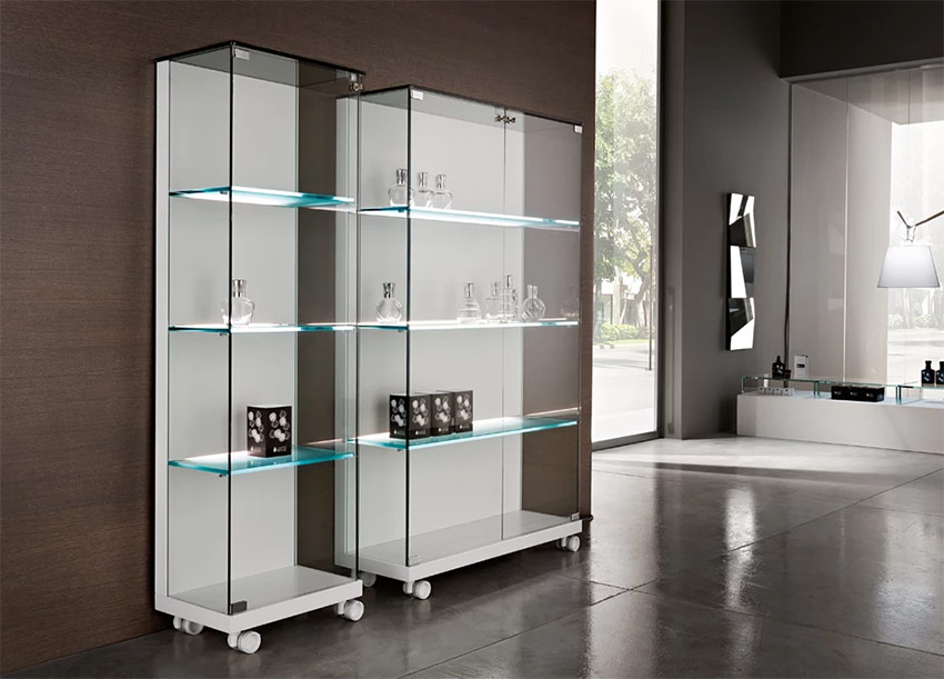 Toutes les vitrines avec tablettes transparentes sont appelées vitrines. Ils sont utilisés dans le commerce, les musées et les expositions. Ils peuvent également décorer l'intérieur de la maison. Les étagères en verre dans les armoires en bois ou les étagères extérieures sur le mur sont plus familiers. Ils sont utilisés pour présenter des verres, de beaux plats, des figurines, des décors ou des livres. Pour un effet décoratif plus important, ces étagères sont éclairées avec un ruban de diode.
